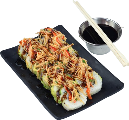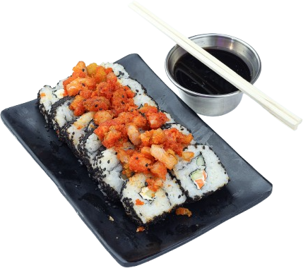 Sushi con ajonjolí coronado con Camarones Empanizados con aderezo picante especial.