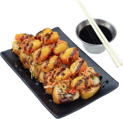 Sushi empanizado coronoado por nuestra ensalada Kanikama, surimi empanizado, bañado con salsa de anguila.