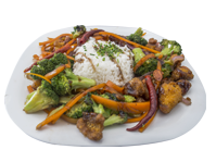 Platillo con zanahoria, brocoli, chile de árbol, pollo empanizado y almendras; acompañado de arroz blanco o pasta y bañado con salsa de anguila.