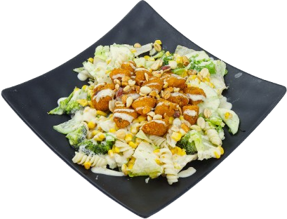 Ensalada con lechuga, pasta, pollo empanizado, brócoli, elote, pepino, aderezo ranch y cacahuate